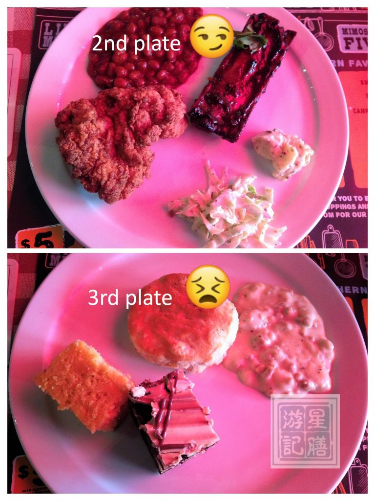 All the potato dishes were runner-ups. The home fries with sauteed onions were crispy on the outside and soft on the inside. The Southern hash brown casseroles and the baked chili and cheese scalloped potatoes were both creamy and cheesy, and very delectable. There was BBQ sauce, hot sauce, and mustard sauce on the side of each table. I relished the fried chicken in their hot sauce; it was sweet and savoury with just a hint of spiciness. We were both disappointed about the ribs. The first batch was very dry, charred, skinny and lacked flavour. The second batch seemed to have slight more juice in the meat but was still overall quite dry. Neither had fall-off-the-bone goodness, and were too charred for our liking. My boyfriend said the first batch almost tasted like it was left over from the day before and re-cooked?. Maybe that was just the style of the ribs?